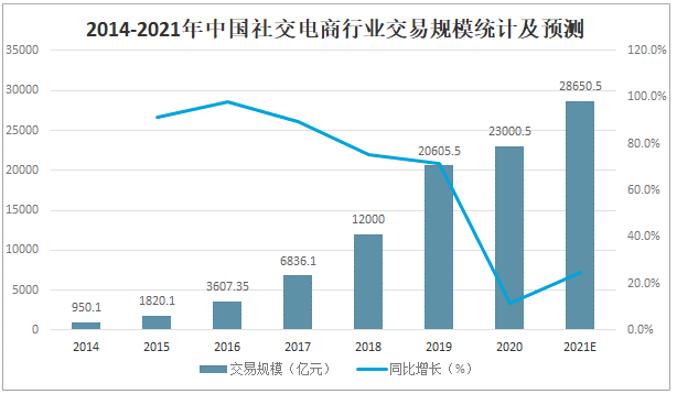 隨著中國社交電商用戶規(guī)模的增加,市場規(guī)模也隨之增長,2020年中國社交電商行業(yè)交易規(guī)模達(dá)23000.5億元,較2019年增加了2395億元,同比增長11.6%,預(yù)計(jì)2021年中國社交電商行業(yè)交易規(guī)模將達(dá)到28650.5億元。