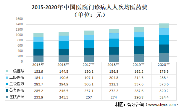 醫(yī)藥費用上漲主要受物價上漲影響,2015-2020年中國醫(yī)院門診病人人次均醫(yī)藥費呈逐年增長趨勢,2020年中國醫(yī)院門診病人人次均醫(yī)藥費324.4元,較2019年增長33.6元;公立醫(yī)院門診病人人次均醫(yī)藥費320.2元,較2019年增長32.60元;三級醫(yī)院門診病人人次均醫(yī)藥費373.6元,較2019年增長36.00元;二級醫(yī)院門診病人人次均醫(yī)藥費238.4元,較2019年增長23.90元;一級醫(yī)院門診病人人次均醫(yī)藥費175.5元,較2019年增長13.3元。