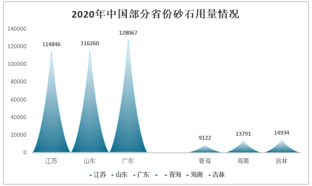 從中國各省份砂石骨料用量情況來看,2020年,砂石骨料用量最大的省份為廣東省,多達128067.23萬噸,山東省、江蘇省分別以116260.38萬噸、114846.38萬噸分列二、三位。而用量最小的三個省份(不含直轄市、自治區)為青海省砂石骨料用量為9122.18萬噸;海南省砂石骨料用量為13791.38萬噸;吉林省砂石骨料用量為14933.55萬噸。2020年中國部分省份砂石用量情況