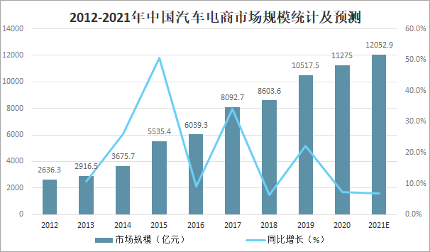 2012-2021年中國汽車電商市場規模統計及預測