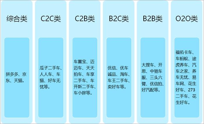 汽車電商是賣家與買家通過互聯網的技術和手段,實現汽車后服務的在線化,便捷化和扁平化。主流模式包括,綜合類:拼多多、京東、天貓;C2C類:瓜子二手車、人人車、車貓、好車無憂等;C2B類:車置寶、邁邁車、天天拍車、車享二手車、車開新二手車、車小胖等;B2C類:優信、優車誠品、淘車、車王二手車、賣好車等;B2B類:大搜車、開思、中馳車服、三頭六臂、優信拍、好汽配等;O2O類:福佑卡車、車螞蟻、途虎養車、汽車之家、養車無憂、易車網、花生好車、273二手車、花生好車。
