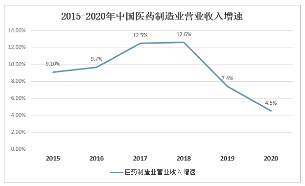根據(jù)國家統(tǒng)計局發(fā)布的數(shù)據(jù)顯示,醫(yī)藥制造業(yè)全國規(guī)模以上企業(yè)營業(yè)收入同比增長4.5%,利潤總額同比增長12.8%。營業(yè)收入增速連續(xù)多年高于GDP和全國規(guī)模以上工業(yè)企業(yè)營業(yè)收入增速。2015-2020年中國醫(yī)藥制造業(yè)營業(yè)收入增速