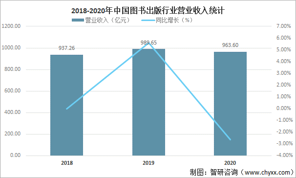 改革開放以來,我國圖書出版行業取得快速發展,規模不斷壯大,2019年中國圖書出版行業營業收入達989.65億元,較2018年增加了52.4億元,同比增長5.59%,2020年較2019年小幅下滑,2020年中國圖書出版行業營業收入為963.60億元,較2019年減少了26.05億元,同比減少2.63%。2018-2020年中國圖書出版行業營業收入統計