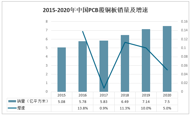 覆銅箔層壓板是將電子玻纖布或其它增強材料浸以樹脂,一面或雙面覆以銅箔并經熱壓而制成的一種板狀材料,簡稱為覆銅板。2020年中國覆銅板產量為7.3億平方米,同比增長6.9%;覆銅板銷量為7.53億平方米,同比增長5.5%。