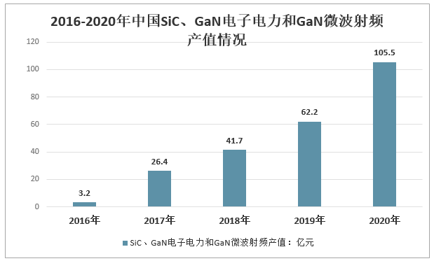 2020年我國SiC、GaN電子電力和GaN微波射頻產值合計達到105.5億元,同比增長69.61%,其中:SiC、GaN電力電子產值44.7億元,GaN微波射頻產值60.8億元。