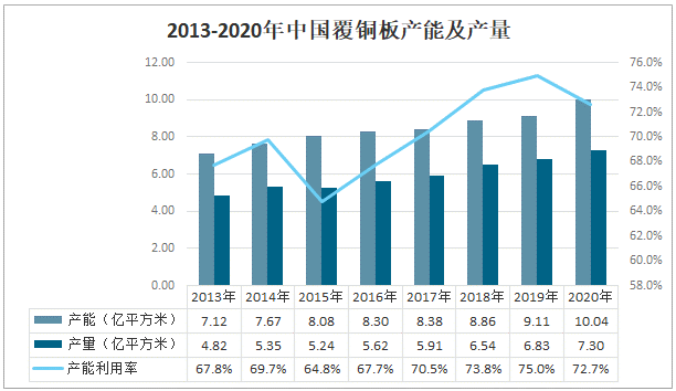 根據CCLA數據:2020年中國覆銅板產能為10.04億平方米,較2019年的9.11億平方米同比增長10.2%;產量為7.30億平方米,較2019年的6.83億平方米同比增長6.9%;產能利用率為72.7%,較2019年下降了2.3%,由于企業無序擴張、技術較落后等因素,中國覆銅板產能利用率并不高。2013-2020年中國覆銅板產能及產量