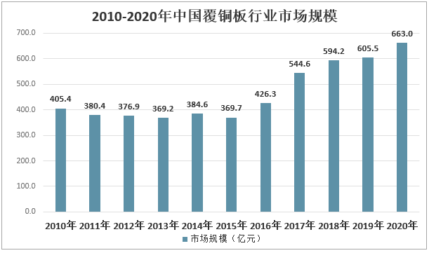 近年來,中國覆銅板行業市場規模整體呈增長態勢,由2015年的369.7億元增加至2020年的663.0億元,年復合增長率為12.4%。