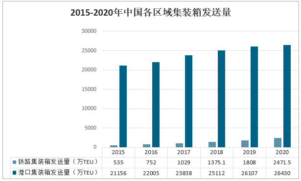 2020年中國鐵路集裝箱發(fā)送量為2471.5萬TEU,同比增長36.75;港口集裝箱發(fā)送量為26430萬TEU,同比增長1.2%。