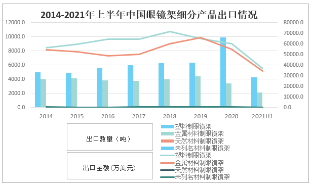 2014-2021年上半年中國眼鏡架細分產品出口情況