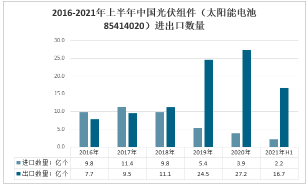 2016-2021年上半年中國光伏組件(太陽能電池85414020)進出口數量