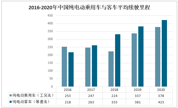 2016-2020年中國純電動乘用車與客車平均續(xù)駛里程