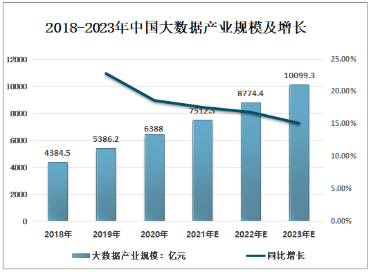 2018-2023年中國大數據產業規模呈現逐年增長趨勢,2020年底,中國大數據產業規模6388億元,較2018年增長2003.5億元;預計2021年中國大數據產業規模7512.3億元。