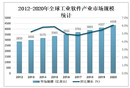發展工業軟件是工業智能化的前提,是工業實現要素驅動向創新驅動轉變的動力,是推動我國由工業大國向工業強國轉變的助推器,是提升工業國際競爭力的重要抓手,是確保工業產業鏈安全與韌性的根本所在,2020年全球工業軟件產業市場規模達4358億美元,較2019年增加了251億美元,同比增長6.1%。2012-2020年全球工業軟件產業市場規模統計