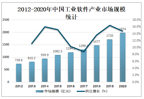 近年來,我國工業軟件取得了長足進步,部分核心軟件技術取得了突破性進展,擁有了部分自主可控的工業軟件產品,培育了中望龍騰、山大華天、數碼大方、安世亞太、同元軟控、華大九天、用友、浪潮、金蝶、和利時、中控等一批國內工業軟件供應商,個別類別軟件和少量單點技術達到國際先進水平。但是我國工業軟件仍處于較多關鍵核心技術缺失,由引進應用向自主研發轉換、技術迭代能力建立的關鍵階段。2020年中國工業軟件產業市場規模達1974億元,較2019年增加了254億元,同比增長14.8%。