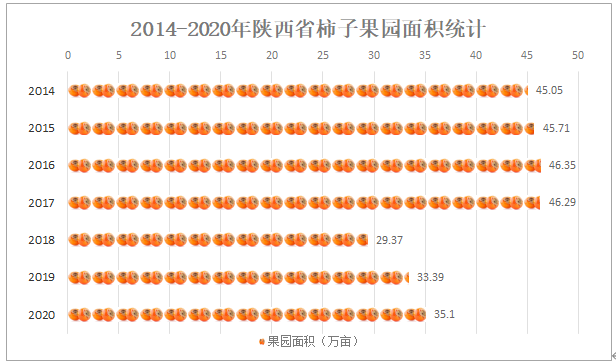 柿子在我國有著悠久的栽培歷史,特別在陜西省有相當大的栽植面積和栽植優勢,2020年陜西省柿子果園面積達35.1,較2019年增加了1.71,同比增長5.1%。