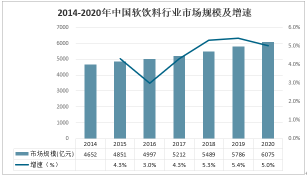 2014-2020年中國軟飲料行業(yè)市場規(guī)模及增速