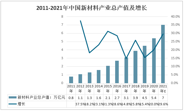2011年我國新材料產業總產值僅僅為0.8萬億元,到2019年我國新材料產業總產值已增長至4.5萬億元,占全球總規模的22.8%,同比增長15.4%,在發達國家新材料行業整體領先,我國在細分領域已取得優勢突破。預計到2021年有望突破7萬億元。