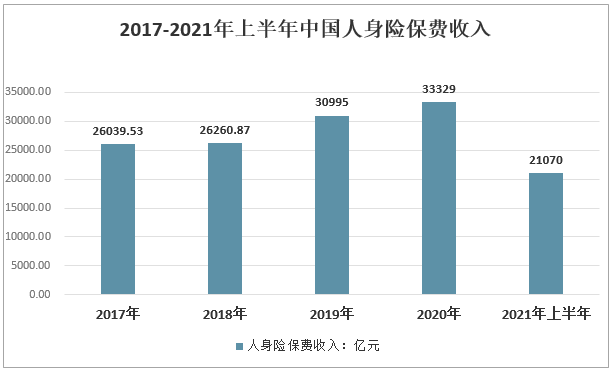 2020年中國人身險保費收入達到33329億元,較2020年增長2334億元;2021年上半年,中國人身險保費收入達到21070億元。
