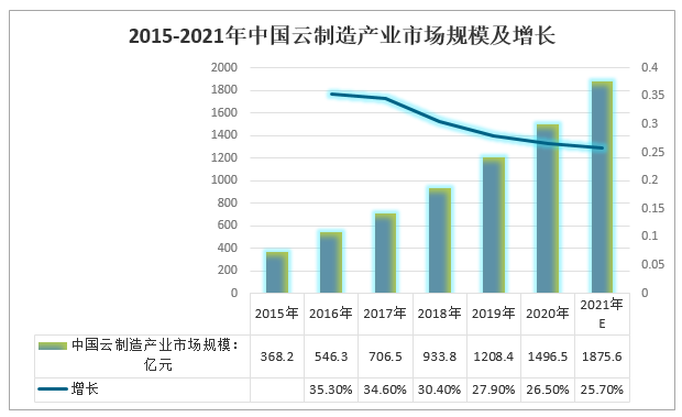 2015-2021年中國云制造產業市場規模及增長