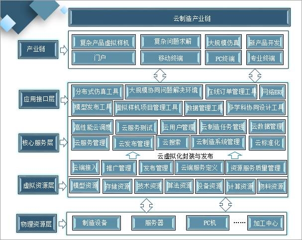 云制造是先進制造技術與新一代信息技術的深度融合,貫穿于產品、制造、服務全生命周期各個環節及制造系統集成。從產業鏈來看,云制造可劃分為物理資源層、虛擬資源層、核心服務層、應用接口層、應用層等五個層面。
