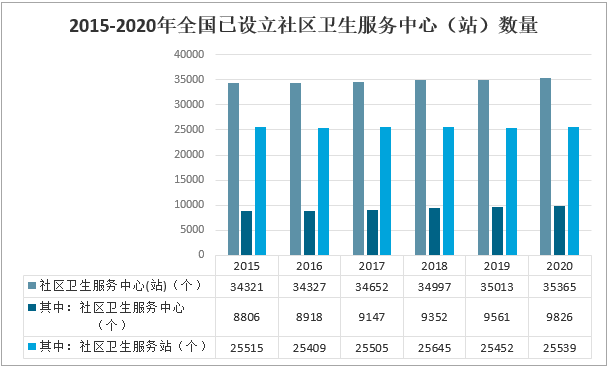2020年底,全國已設立社區衛生服務中心(站)35365個,其中:社區衛生服務中心9826個,社區衛生服務站25539個。與上年相比,社區衛生服務中心增加265個,社區衛生服務站增加87個。