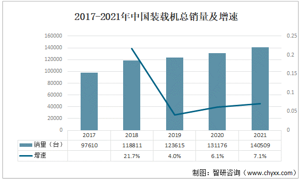 2017-2021年中國裝載機總銷量及增速