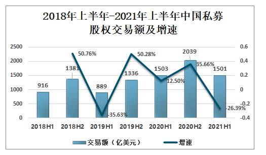 2018年上半年-2021年上半年中國私募股權交易額及增速