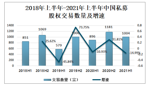 2018年上半年-2021年上半年中國私募股權交易數量及增速