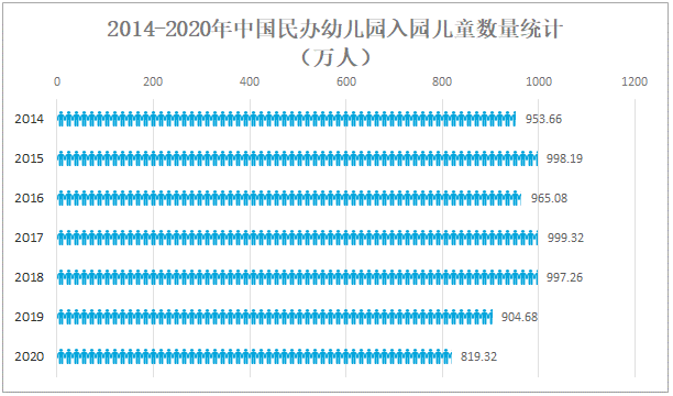 2014-2020年中國民辦幼兒園入園兒童數量統計