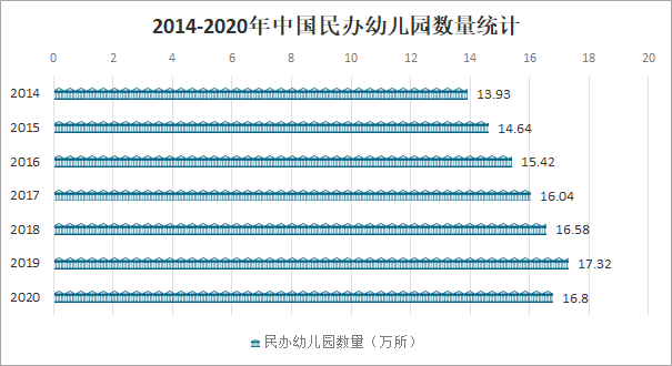 隨著國家對學前教育行業的不斷重視,民辦幼兒園也迎來了發展的春天,這其中不乏社會現實原因與國家政策的支持,其不僅對于學前教育行業起到了積極的支持作用,也對整個國家教育的發展、教育計劃的實施起到了一定的積極作用,對于國民素質的提高、社會的進步也都起到了一定的貢獻,近年來中國民辦幼兒園數量逐年攀升,2019年中國民辦幼兒園數量達19.15萬所,較2018年增加了0.80萬所,同比增長4.4%,2020年中國民辦幼兒園數量首次出現下滑,2020年中國共有18.67萬所民辦幼兒園,較2019年減少了0.52萬所,同比減少3.0%。2014-2020年中國民辦幼兒園數量統計