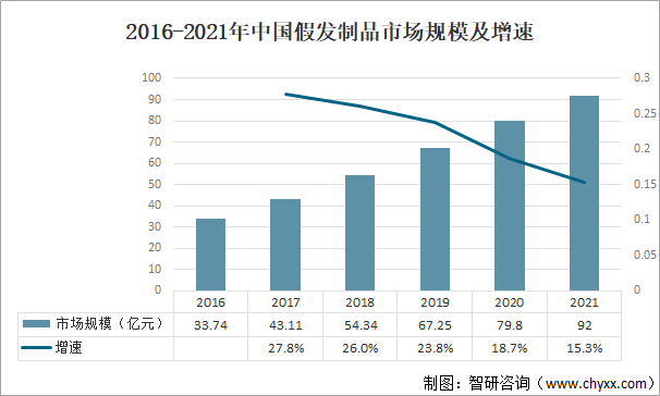 2021年中國假發(fā)制品市場規(guī)模約為92億元,同比增長15.3%。