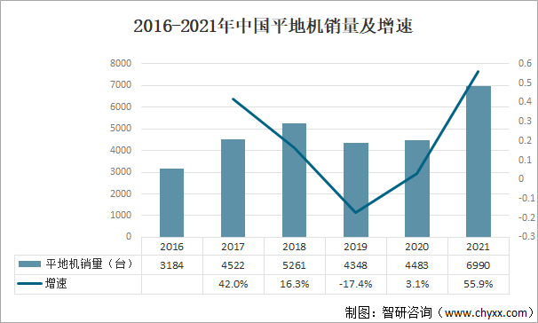 2016-2021年中國平地機銷量及增速