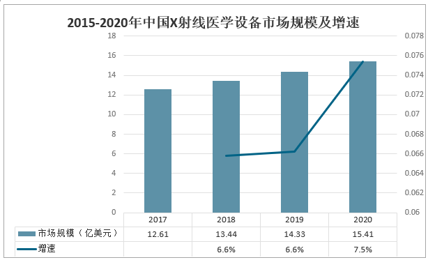 醫用X射線設備是指發生并控制X射線用于對人體組織放射檢查及放射治療的設備,該類設備具有X射線發生裝置,患者床及設備支撐裝置,過濾板等必要部分,還可能包括信號分析和顯示部分,冷卻系統,體腔治療管和治療方案程序等。2020年中國X射線醫學設備市場規模約為15.41億美元,同比增長7.5%。2015-2020年中國X射線醫學設備市場規模及增速