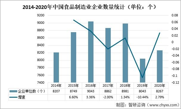 食品工業(yè)的現(xiàn)代化水平已成為反映人民生活質(zhì)量高低及國家發(fā)展程度的重要標志。2020年中國共有食品制造業(yè)企業(yè)8267個,較2019年增加了224個,同比增漲2.79%。