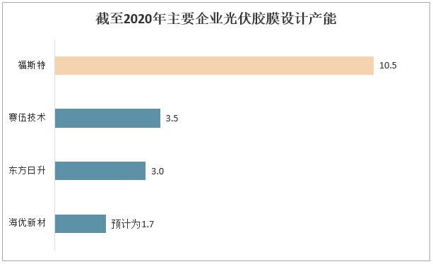 中國光伏膠膜產(chǎn)能主要集中在福斯特、賽伍技術(shù)、東方日升等企業(yè),其中福斯特為行業(yè)龍頭企業(yè),產(chǎn)能占比超50%;2020年福斯特光伏膠膜設(shè)計產(chǎn)能達10.51億平方米,賽伍技術(shù)光伏膠膜設(shè)計產(chǎn)能為3.5億平方米,東方日升光伏膠膜設(shè)計產(chǎn)能為3.0億平方米,海優(yōu)新材光伏膠膜設(shè)計產(chǎn)能預(yù)計為1.7億平方米。截至2020年主要企業(yè)光伏膠膜設(shè)計產(chǎn)能