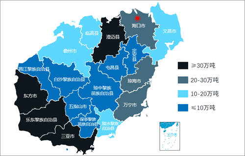 海南作為中國最南端的省份,“青山綠水”是海南發展特色熱帶水果的獨特資源優勢。海南光熱資源豐富,平均氣溫22~26℃,年降雨量1000~2600mL,全年暖熱,有“天然大溫室”之稱,十分適合熱帶水果的生長,為發展熱帶水果產業的“天時”。同時,良好的區域布局有利于水果產業的專業化協作、專業化生產與銷售,海南的香蕉有瓊南-西南部香蕉優勢區、瓊西-西北-北部香蕉優勢區、中部山地蕉重點發展區、東部特色香蕉區,芒果有三亞市、陵水縣、樂東縣、昌江縣、東方市等優勢區,荔枝則主要分布在海南省東部、東南部、東北部、北部等地,橙子主要集中在瓊中。因海南各地地理環境的差異、氣候條件的微差等導致的水果種植區域化明顯,現已逐漸形成了各地的差異水果種植優勢,實為發展熱帶水果產業的“地利”。海南水果產量分布