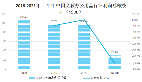 隨著中國文教辦公用品行業營業收入的增加,利潤總額也隨之增長,2020年中國文教辦公用品行業利潤總額達98.61億元,較2019年增加了0.88億元,同比增長0.9%,2021年上半年中國文教辦公用品行業利潤總額已完成29.48億元。