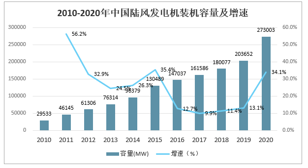 2010-2020年中國(guó)陸風(fēng)發(fā)電機(jī)裝機(jī)容量及增速