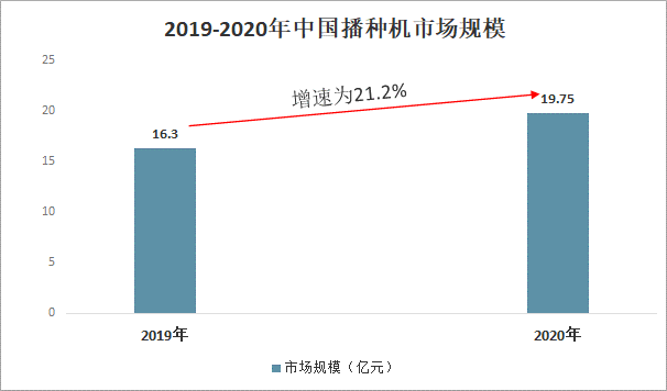 中國播種機市場規模進一步擴大,2019年中國播種機市場規模為16.3億元,2020年中國播種機市場規模約為19.75億元,同比增長21.2%。
