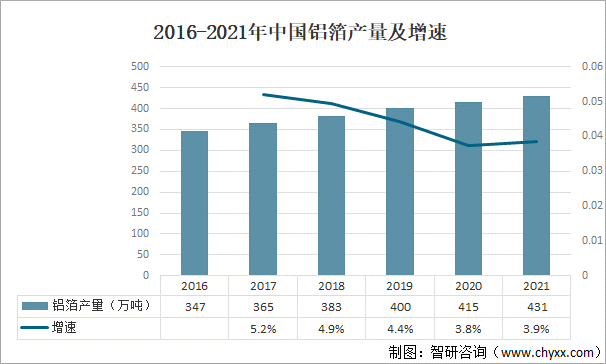 2016-2021年中國(guó)鋁箔產(chǎn)量及增速