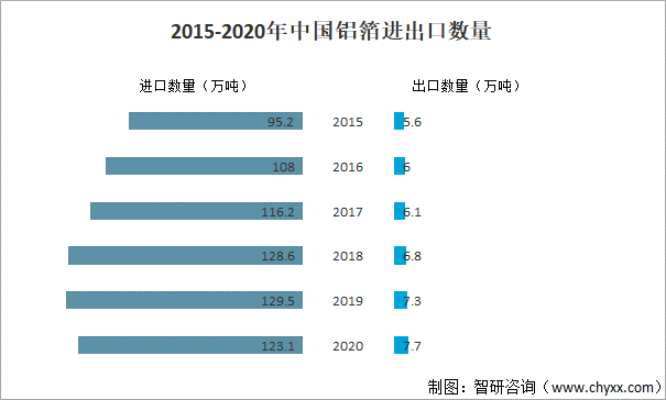 我國(guó)鋁箔需求量較大,進(jìn)口數(shù)量大于出口數(shù)量。其中2020年中國(guó)鋁箔進(jìn)口數(shù)量為123.1萬(wàn)噸,同比下降4.9%;出口數(shù)量為7.7萬(wàn)噸,同比增長(zhǎng)5.5%。