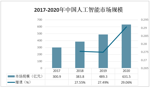 2017-2020年,中國人工智能市場規模持續保持較高的增長率。2019年,人工智能企業開始加快落地應用探索,基礎層、技術層企業開始向應用層下游滲透,人工智能相關應用產品更加豐富,對于不同應用場景,人工智能企業能夠提供更全面的綜合智能化解決方案。2020年中國人工智能市場規模達到631.5億元,增長率為29.06%。預計未來中國人工智能市場將穩步向前,人工智能的場景落地以及市場開拓將在各行各業中穩定展開。