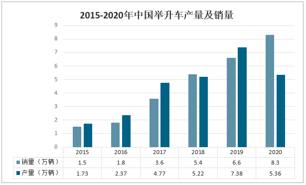 2015-2020年中國舉升車產量及銷量