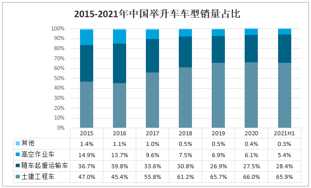2015-2021年中國舉升車車型銷量占比
