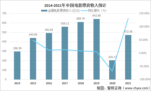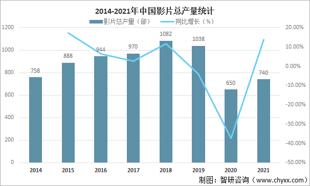 新冠肺炎對世界經濟帶來了巨大的沖擊,特別是對電影產業帶來了變革,當前中國防疫已取得重要成果,電影產業也逐漸復蘇,2021年中國影片總產量共計740部,較2020年增加了90部,同比增長13.85%,其中電影故事片為565部。全年票房前10名影片中有8部國產影片。其中最值得關注的就是在國慶檔上映的影片《長津湖》,這部電影弘揚了偉大抗美援朝精神,激起了民眾的愛國主義情緒,引發了一波觀影熱潮,最終超越《戰狼2》成功登頂中國影史票房冠軍。此外,2021年是中國共產黨建黨100周年,《革命者》《我和我的父輩》《守島人》《中國醫生》《懸崖之上》等一系列重點獻禮影片也質量過硬,激起了廣大觀眾愛黨愛國的熱情。