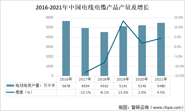 2021年中國電線電纜產品產量及增長