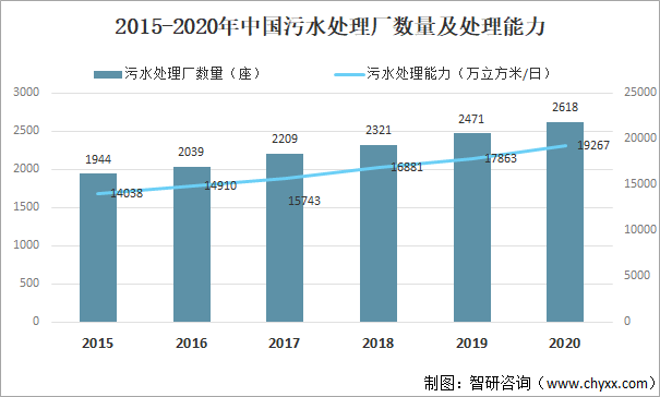 2015-2020年中國污水處理廠數量及處理能力