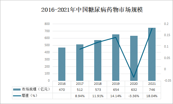 圖表4:2017-2021年中國(guó)糖尿病藥物行業(yè)市場(chǎng)規(guī)模
