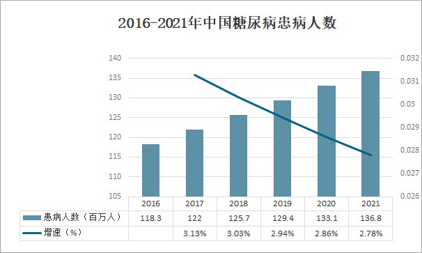 中國(guó)是糖尿病患者大國(guó),中國(guó)糖尿病患者數(shù)量從 2016 年的 1.18億增長(zhǎng)至 2020 年的 1.33 億,復(fù)合年增長(zhǎng)率為 3.0%。由于人口老齡化和不健康的生活方式的負(fù)面影響,預(yù)計(jì)我國(guó)糖尿病患病人數(shù)將在 2021 年達(dá)到 1.37 億。