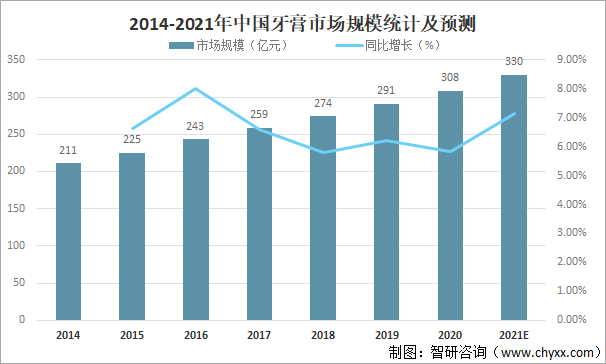 2014-2021年中國牙膏市場規(guī)模統(tǒng)計及預(yù)測